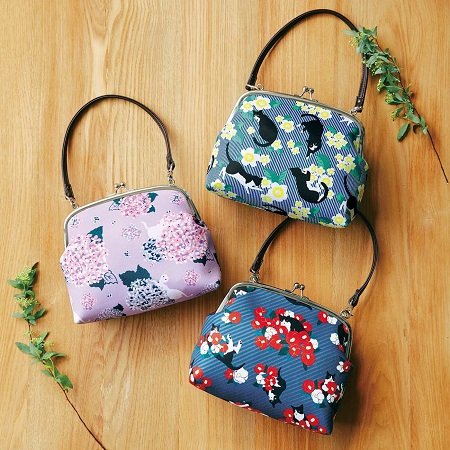 フェリシモでは他にも愛らしい猫グッズが販売されています。たとえば、こちらの「お花とたわむれる猫のころんとかわいいがま口バッグの会」は、浴衣とセットで使っても素敵です。