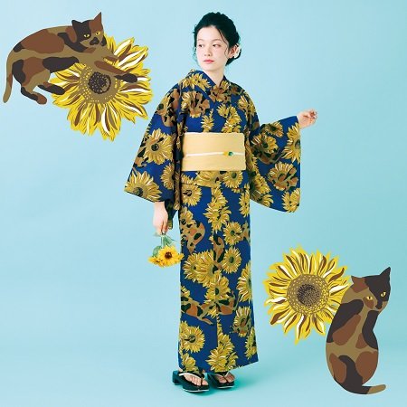フェリシモの「サビ猫とひまわりのモダン浴衣」は夏を楽しくしてくれる! 京都や奈良へのお出かけにも!