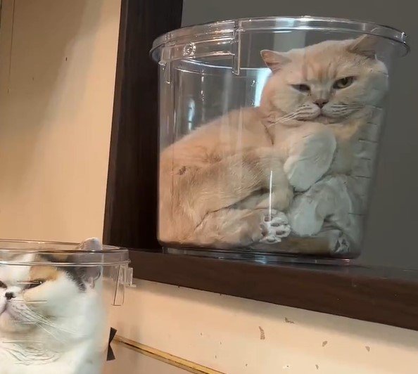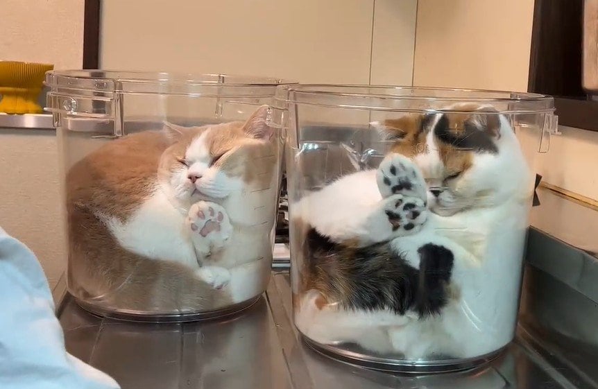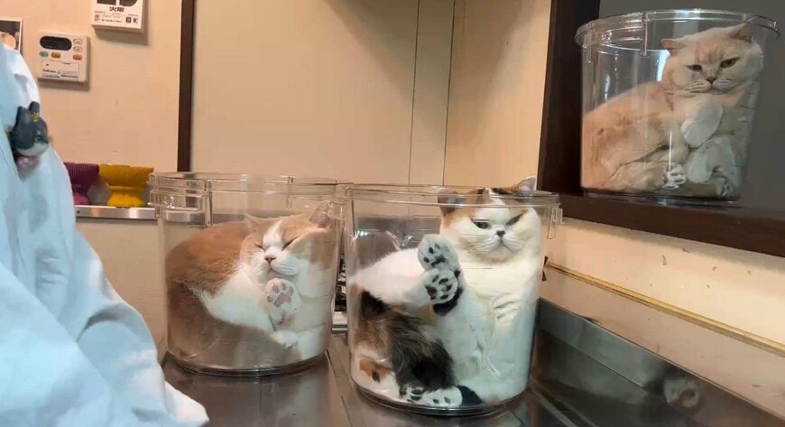 そして3匹の猫ちゃん達は、バケツといった「狭い場所」がお気に入りなのだそう。バケツに入って行った猫ちゃんたちは、中で悠々としたくつろぎぶりを見せています。