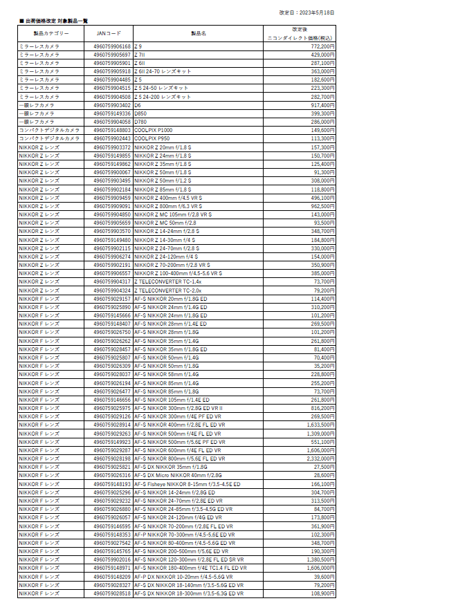 ニコンは5月18日にミラーレスカメラ・一眼レフカメラ・コンパクトデジタルカメラ・交換レンズの出荷価格を改定を実施します。