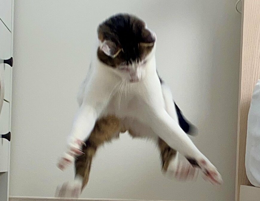 そんなセロイくんはこの日、新しいお魚のおもちゃで遊んでいた様子。1枚目には、両手足を大きく広げたセロイくんが「大ジャンプ」をする瞬間がおさめられていました。「ヒャッハー!」といったセリフが聞こえてきそうな、大胆なジャンプに視線を惹かれます!