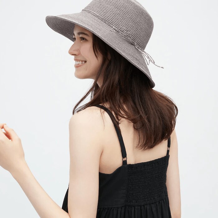 帽子を使って、髪の毛も紫外線対策を行いましょう。このハットは、軽い素材感とUVカット機能を両立させたアイテムです。一気にコーディネートがおしゃれになりますよ。