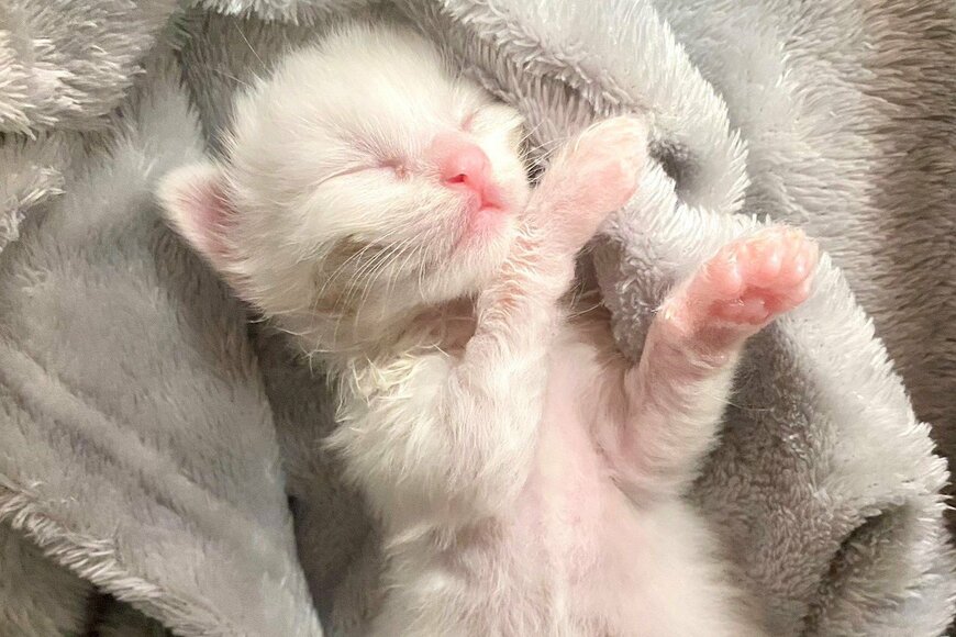 生後2週間頃に保護された白猫の男の子「マオ」くん