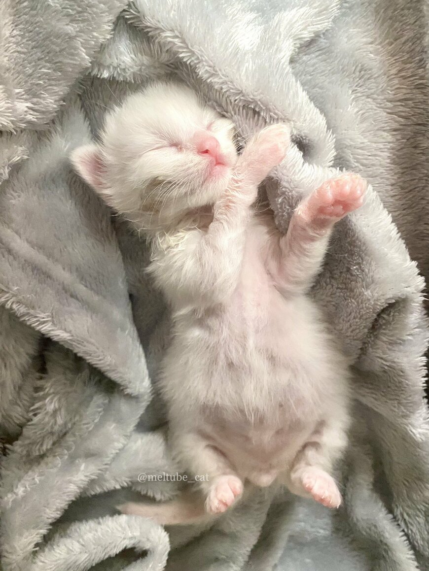 1枚目には、保護されて間もない頃と思われるマオくんの姿があります。お布団の上で仰向けになり、スヤスヤと眠るマオくん。ちっちゃな身体やふわふわとした毛並みからは、赤ちゃんらしさが漂います。