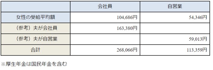 下表は女性の平均受給額を会社員と自営業にわけて記載しました。参考として夫が会社員、自営業のときに夫婦で受け取る平均受給額も出しました。