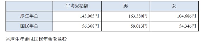 全体の厚生年金受給額の平均は14万3965円。男性は16万3380円、女性は10万4686円となっています(※国民年金受給額を含む)。