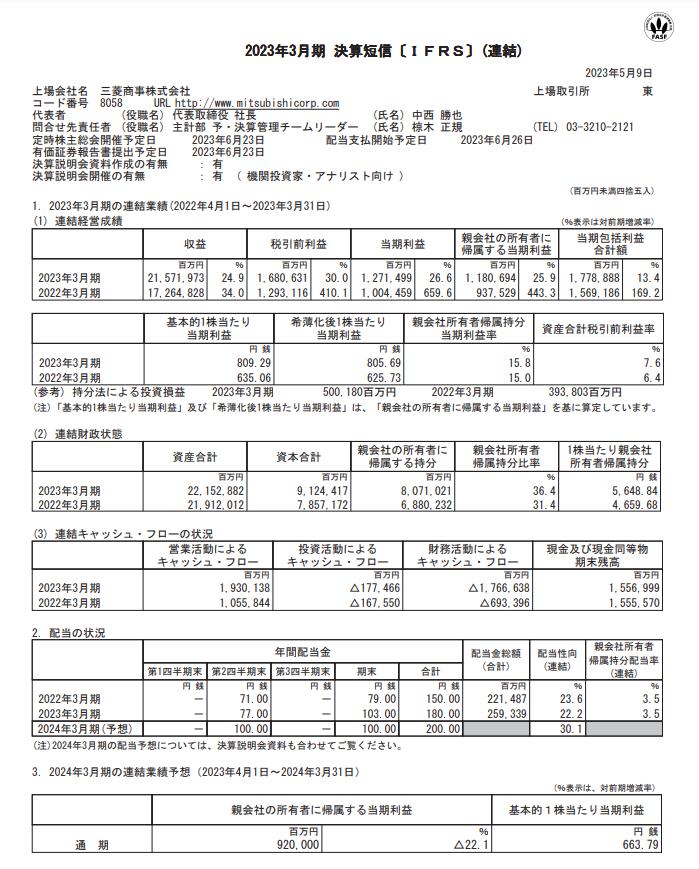 三菱商事の株式を1年前に買い、持ち続けたとすると、「2023年3月期の中間配当と、2023年3月期の期末配当」の計2回を受け取ることができます。