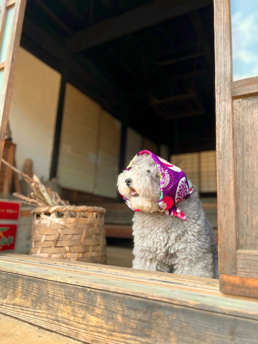 話題になったのはトイプードルの5歳の男の子「れある」くん。写真に写るれあるくんは、紫色の頬被りをして外を眺めている様子ですが……?