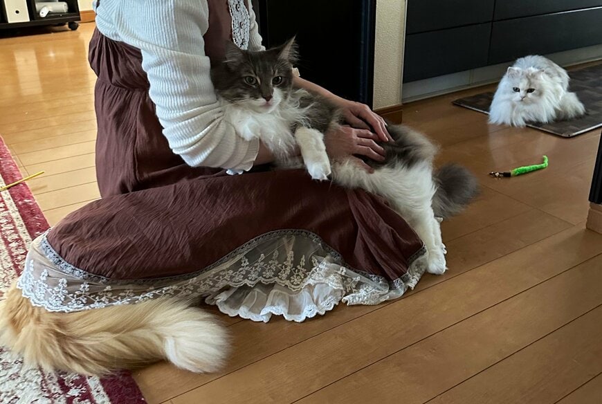 お膝の上には、抱っこされるようにしてくつろぐ「レイ」くんがいます。「エマ」ちゃんはママさんの洋服の中に入り込んでいるようで、フサフサのシッポをちらりと覗かせていました。