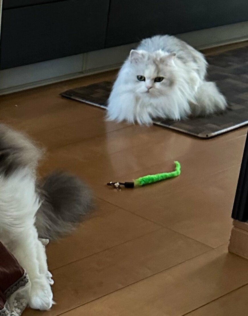 そして少し離れたところには……?おもちゃの前で香箱座りをし「遊んでよ~」と言いたげな表情を浮かべる「ノーマン」くんの姿があります。