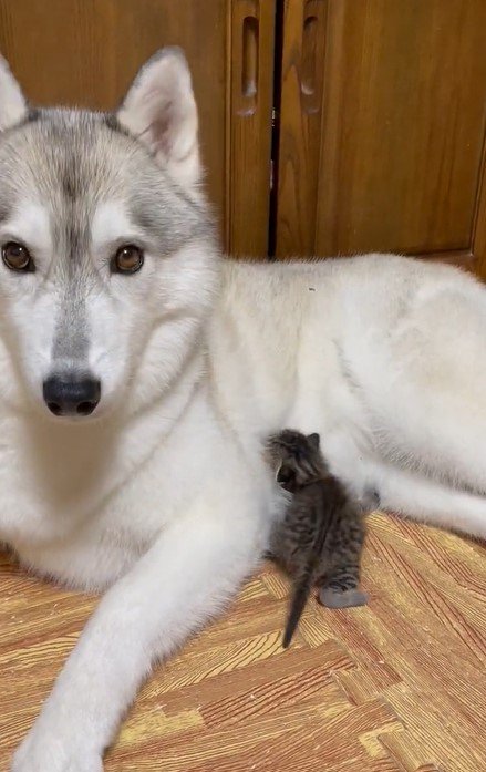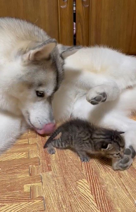 あどけない動作で甘える子猫ちゃんを、懸命にお世話するママハスキー。2匹の尊いワンシーンがTwitterで注目を集めています。