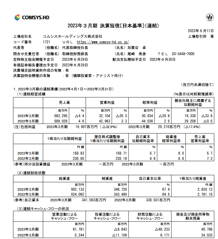 コムシスホールディングス(1721)の株価は上昇。配当利回りは3.7%(2023年5月12日・株式取引概況)