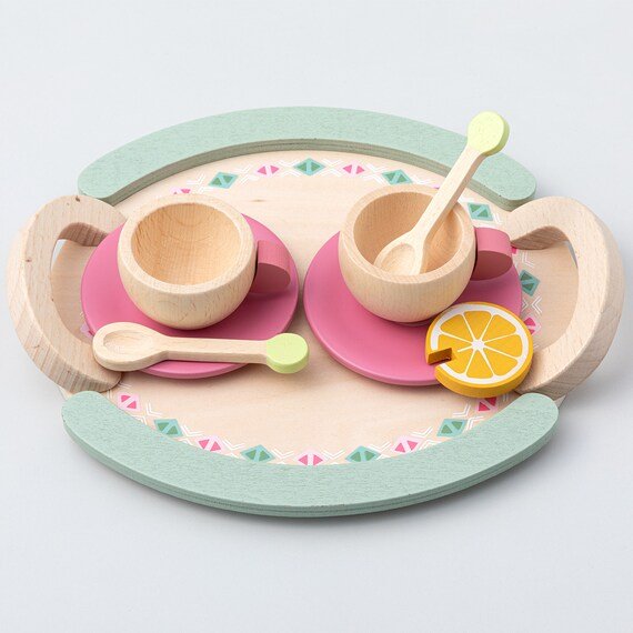 かわいらしいトレイ付きの「ティータイム 木製おままごとセット」です。レモンも木で作られています。