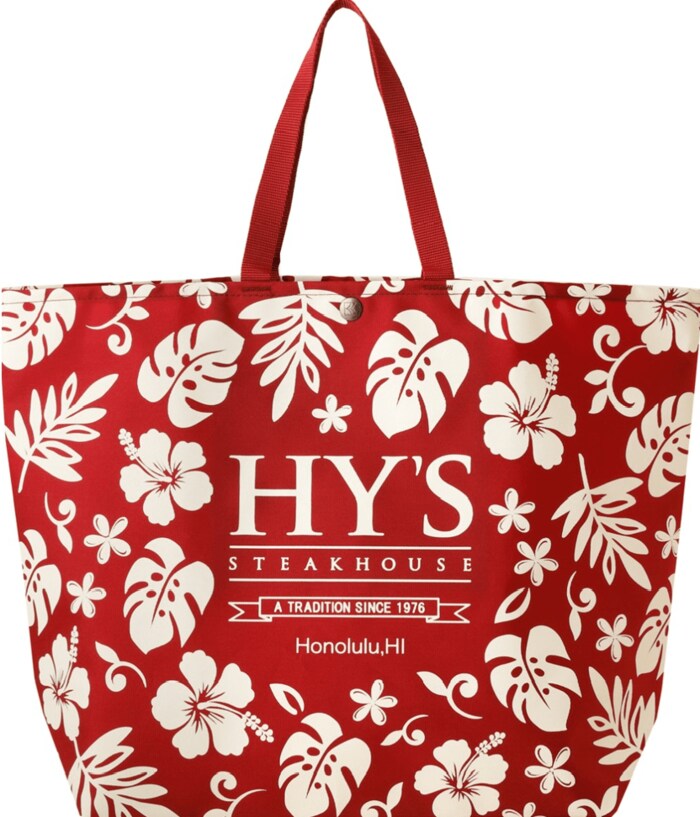 現在、こちらのコラボアイテムは、ハワイ・ホノルルの「Hy's Steak House(ハイズステーキハウス)」の店舗(オンラインストア含む)のみ購入できるレアアイテムで、レッドカラー生地のバッグにハワイ州の花、「ハイビスカス」の絵柄が目を引くHy's Steak House (ハイズステーキハウス)と、紀ノ国屋らしいデザインが目を引くオリジナルバッグとなっています。