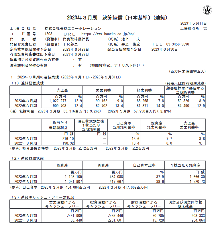 長谷工コーポレーション(1808)の株価は上昇。配当利回りは4.8%(2023年5月15日・株式取引概況)