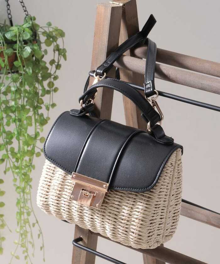 雑材素材のバッグはカジュアルになりがちですが、こちらのアイテムはフェイクレザーや金具を活用することで高見えする仕上がりとなっています。