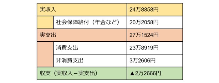 実収入から実支出を引いて1か月の収支を出すと、2万2666円の赤字となります。