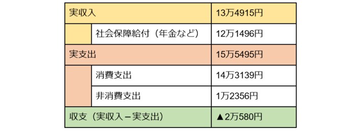 生活費(消費支出)の14万3139円と税金や社会保険料などの非消費支出1万2356円を合わせた実支出は15万5495円となっています。