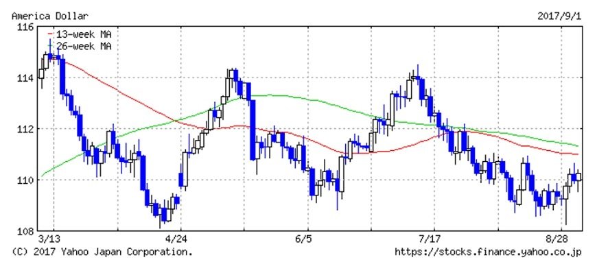 8月29日の朝方に北朝鮮が発射したミサイルが北海道上空を通過し、北太平洋に落下しました。これを受け、ドル/円は円高が進み一時108.2円台にまで値を下げたものの、4月に付けた108.1円台の年初来安値は下回ることなく反転しました。その後は一転、急速に円安が進み、31日には110.6円台になるなど安値から2日間で2円以上の円安となりました。