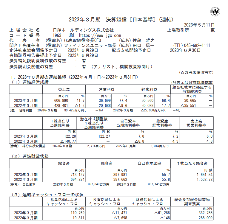日揮ホールディングス(1963)の株価は下落。配当利回りは2.4%(2023年5月16日・株式取引概況)