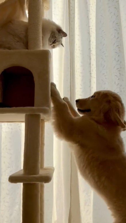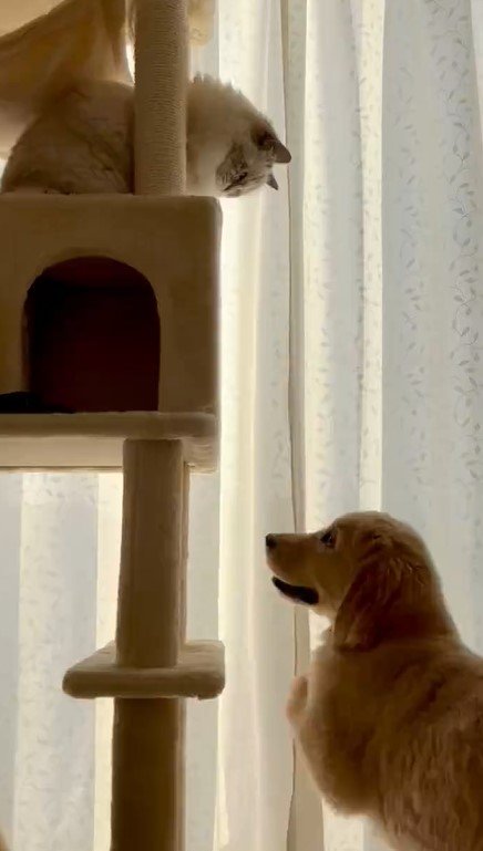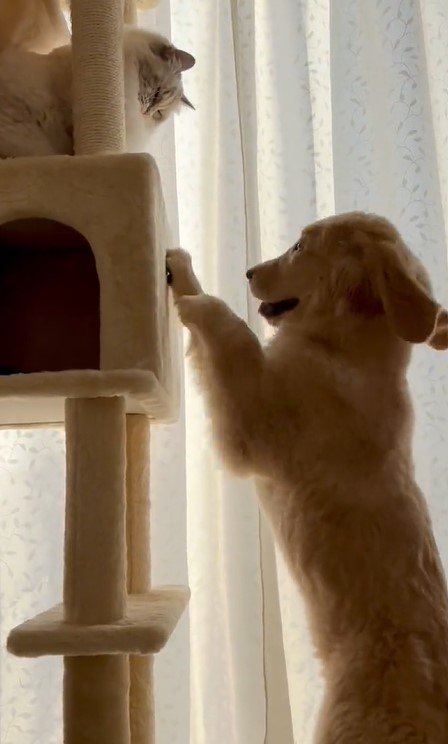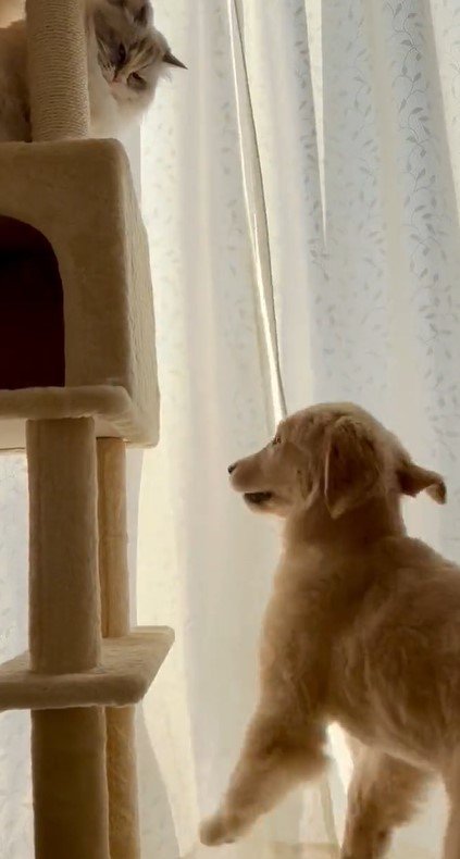 SNSで反響を呼んでいる、キャットタワーで爪とぎのような動作をする子犬と、それを見守る猫ちゃんの様子をご紹介しました。