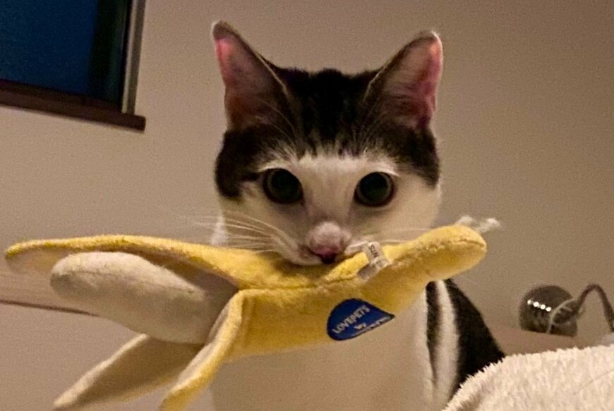 普段から、おもちゃ遊びが大好きだというセロイくん。写真には、ベッドの上でバナナのおもちゃを咥えながら「ジッ」と視線を送る姿がおさめられていました。
