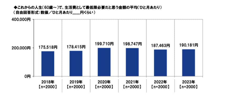 PGF生命の同調査によれば、これからの人生で生活費として最低限必要だと思う金額を聞いたところ、平均額で平均19万181円でした。