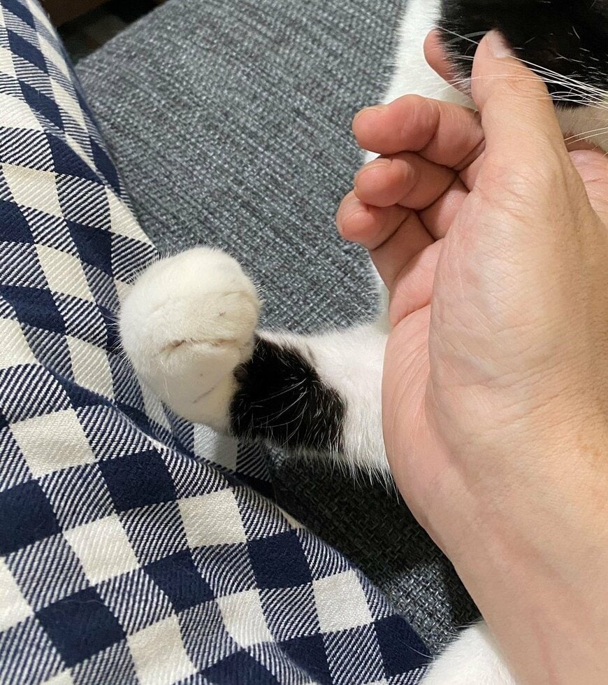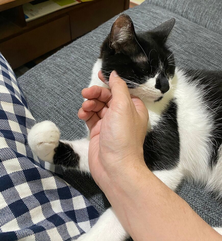 そして、途中で撫でる手を止めたという飼い主さんですが、モズクちゃんの右手を見てみると……?