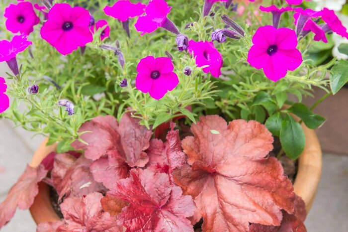 ヒューケラのカラーに合わせて、ペチュニアの色を選んでみるのもオススメです。ヒューケラが濃いパープルなら、ペチュニアは淡いパープルを選ぶと、センスよく仕上がります。