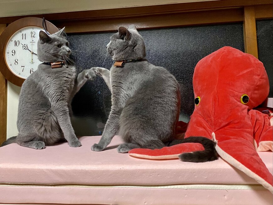 そんな2匹は、向き合って「グータッチ」を決めているかのような格好をしていますね。一瞬「鏡が置いてあるのでは?」と思うようなシンクロ姿にホッコリします。
