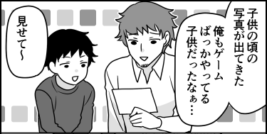 「大きくなったものと小さくなったもの」というコメントとともに投稿されたのは、自分が子どもの頃の写真を息子さんらしき少年と一緒に見ているシーンを切り取った5コマ漫画でした。