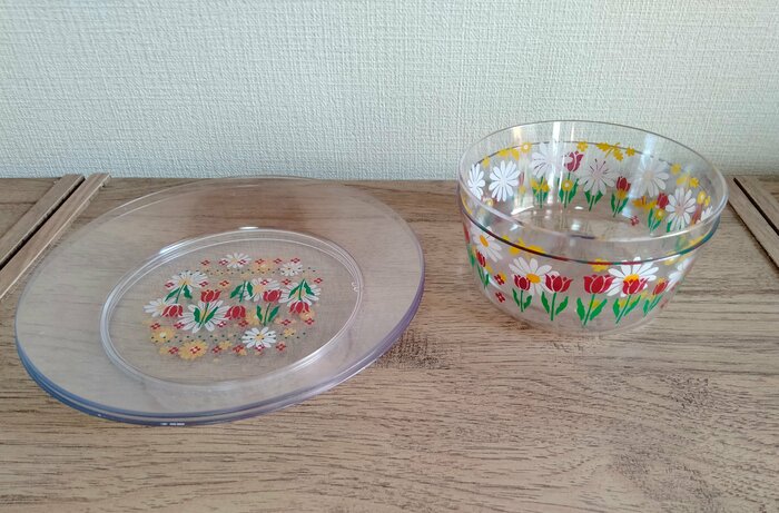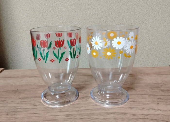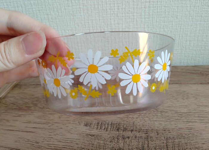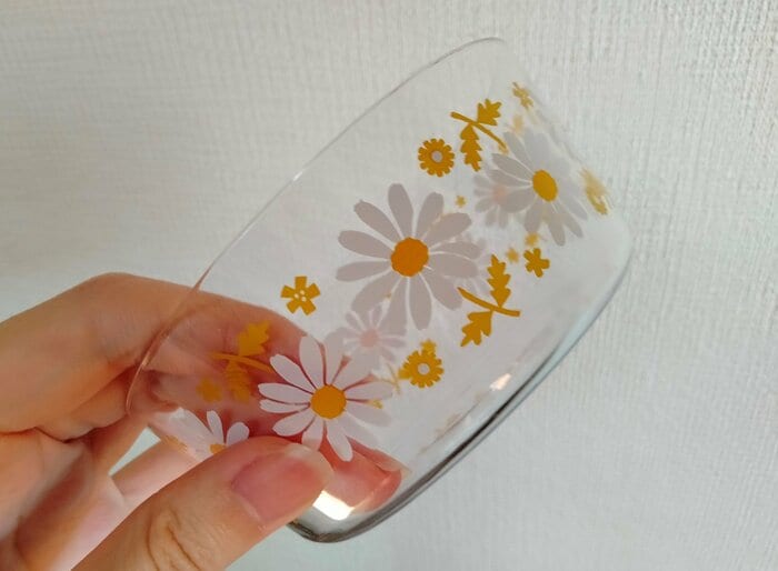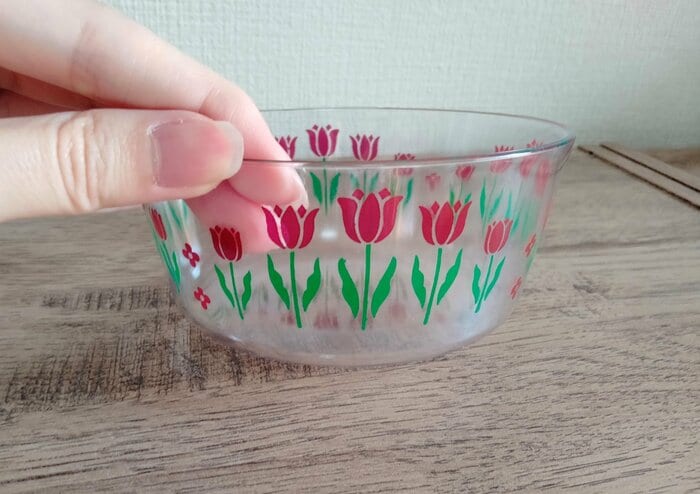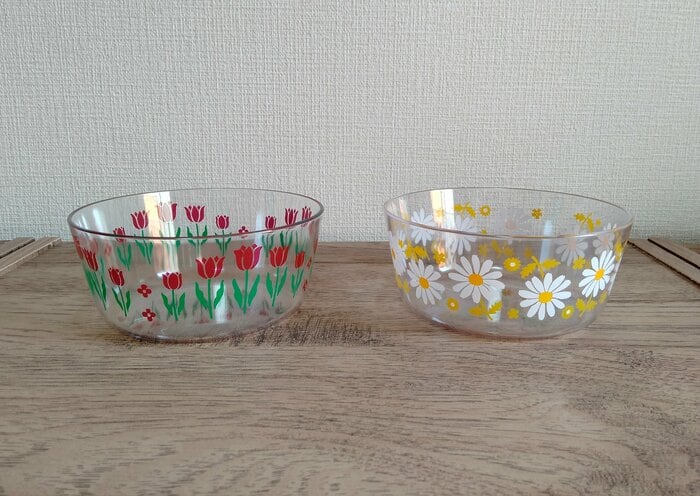 こちらがセリアで販売されている「レトロデザインのクリアボウル」です。チューリップ(写真左側)と、マーガレット(写真右側)の2種類があります。