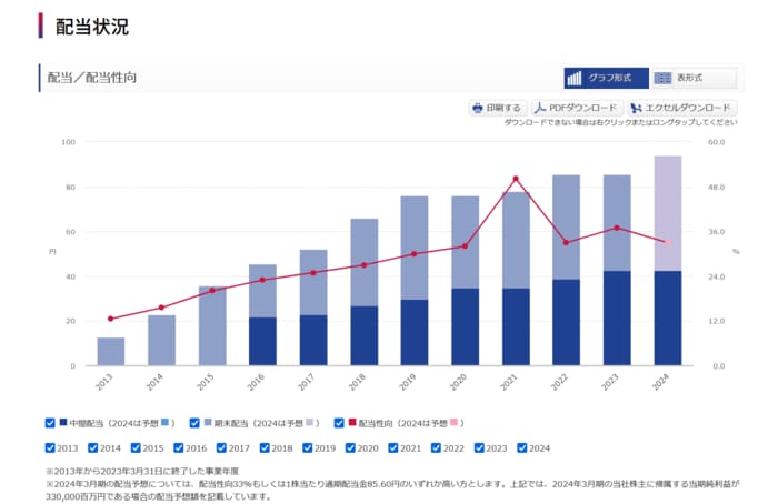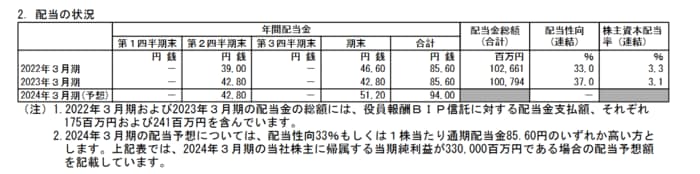 なお、オリックスの2024年3月期の配当金予想は中間で42.80円、期末で51.20円、合計94円となっています。
