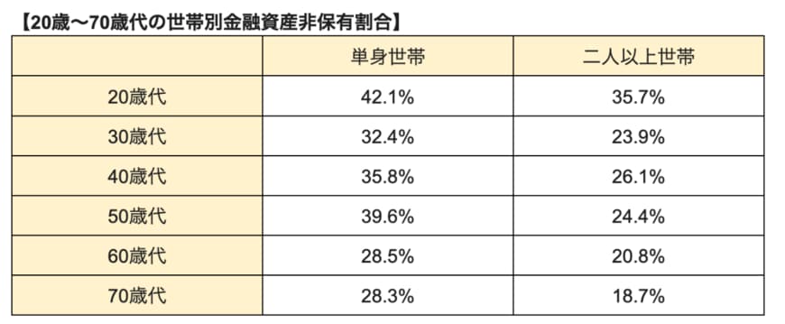 下図は20歳〜70歳代の単身世帯と二人以上世帯で、金融資産非保有の割合をまとめたものになります。