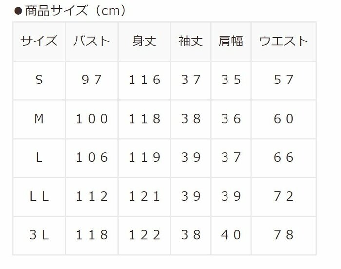 サイズはSからLLまであります。オンラインストア限定で3Lサイズも販売されています。身丈は120cm前後あるので、上品に着こなすことができそうです。
