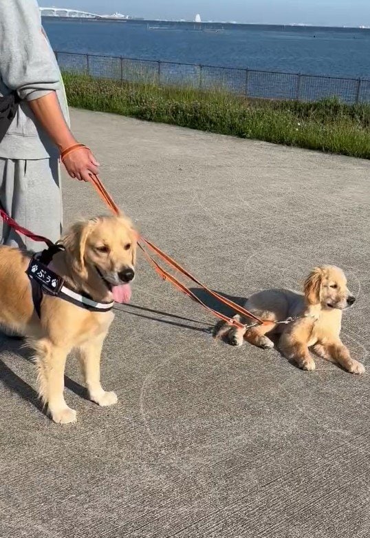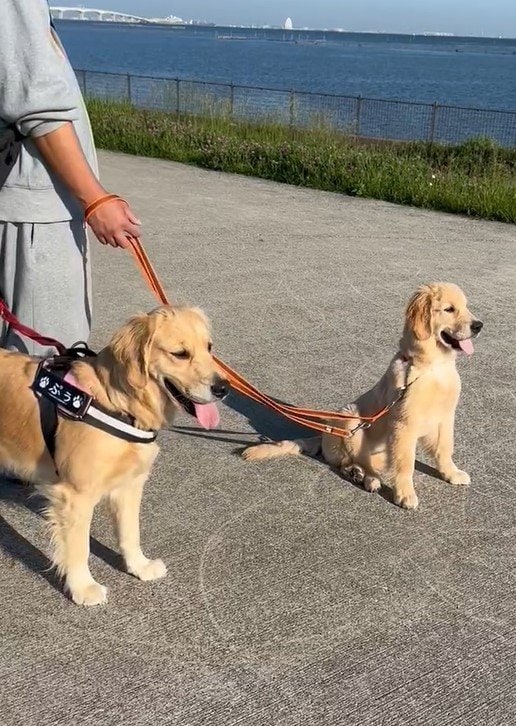 SNSで注目を浴びているのは、ゴールデンレトリバーの「ぷぅ」ちゃんと、ぷぅちゃんから生まれた「つゆ」ちゃん。この日、親子揃って散歩に出かけた様子の2匹。