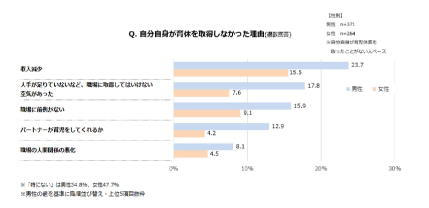 上記調査の結果、男性が育休を取らなかった理由として「収入減少」が最も多く挙げられました。