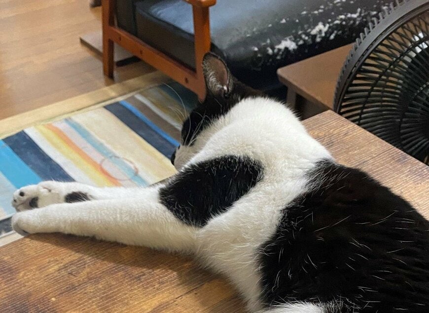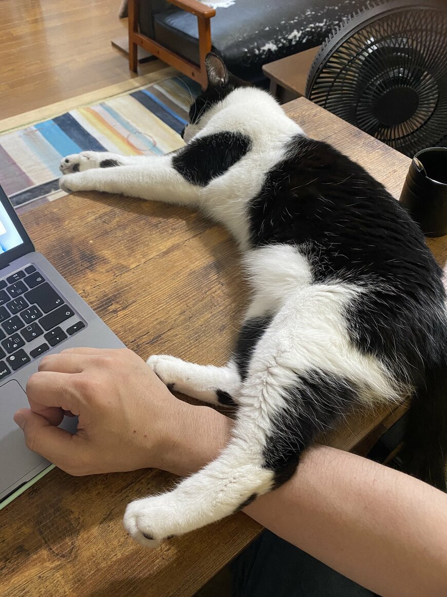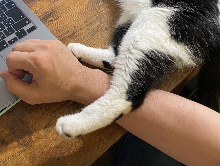 机の上に横たわったモズクちゃんは、作業する飼い主さんの腕の上に片足をチョコンと乗せています。マイペースな雰囲気でくつろぎつつも、足はしっかりと飼い主さんに密着させるモズクちゃん。