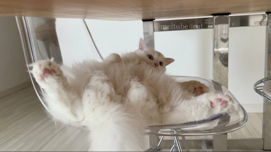 そして最後の3枚目には、両足をパッカーンと広げるマオくんが写っています。透明のイスをベッドのように使いこなす姿が可愛くて、思わず笑みがこぼれてしまいますね。