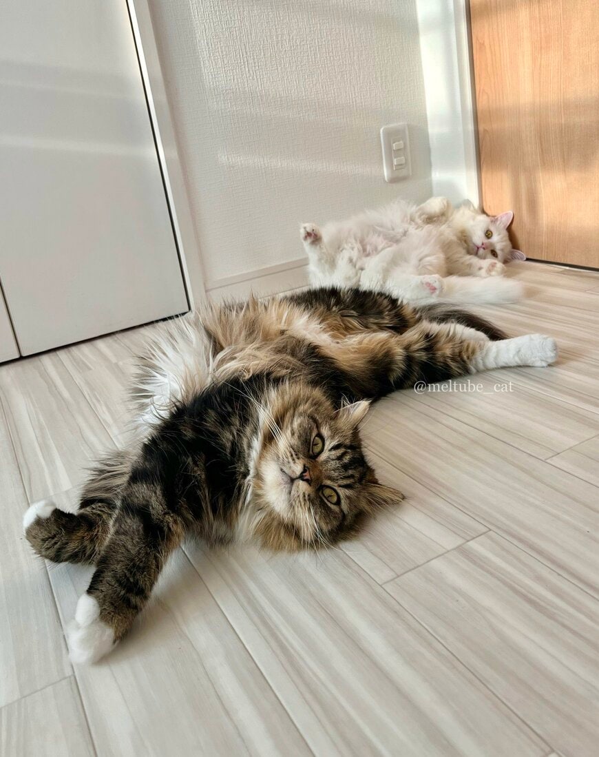 2匹の猫ちゃん達が、揃って「大胆すぎるくつろぎ姿」を見せるほほえましい光景がTwitterで注目を集めています。