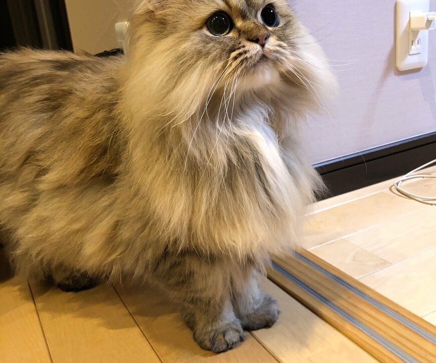注目を浴びているのは猫の「パピコ」くん。穏やかな性格をしたチンチラゴールデンの男の子です。写真には、両手をちょこんと揃えてお行儀よく立つパピコくんの姿がありました。