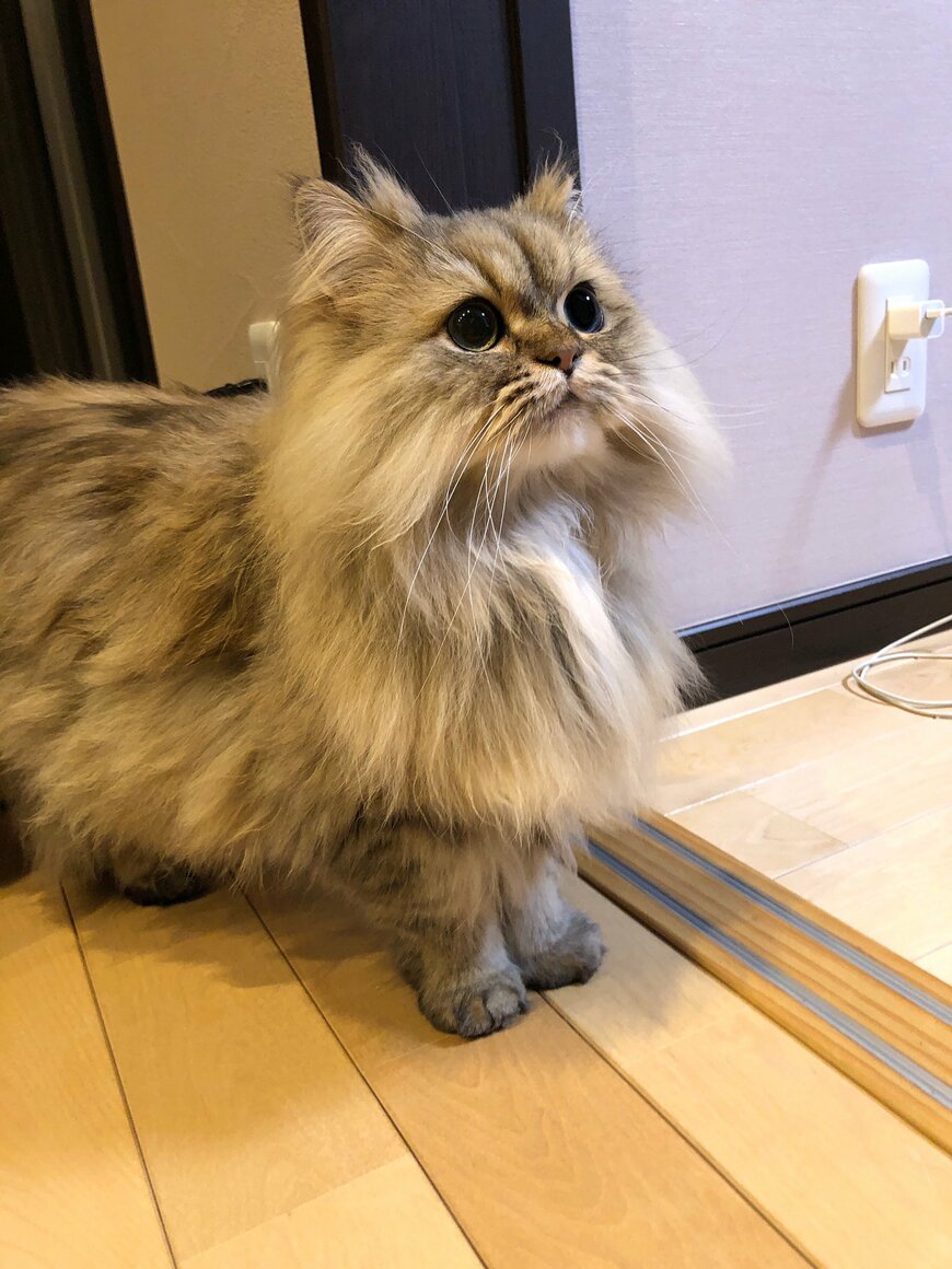 パピコくんは「だっこ待ち」をしていたようで、まん丸の瞳を輝かせるように一点を見つめています。下に向けたおひげや上目遣いの眼差しも目を惹きます。健気で愛らしい佇まいに、心をくすぐられてしまいますね……!