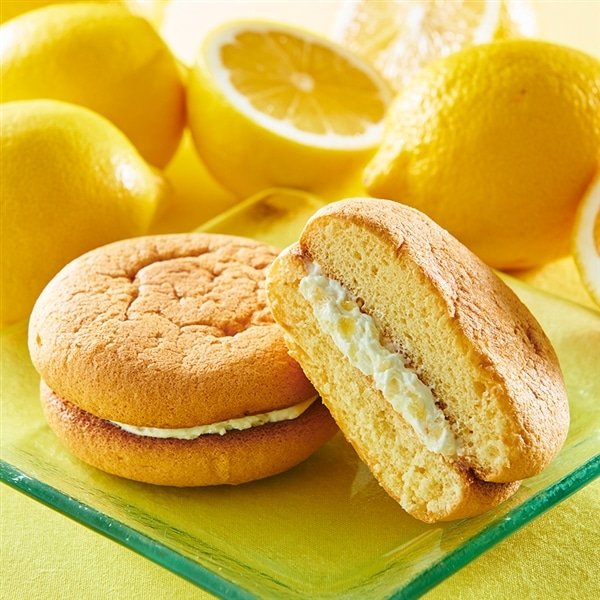 ふっくら柔らかく焼き上げたきめ細かなブッセ生地で、レモン風味クリームをサンド。口溶けのよい滑らかなクリームにホワイトチョコをブレンドし、そこへ香りのよい瀬戸内レモン皮砂糖漬けのダイスを加えています。