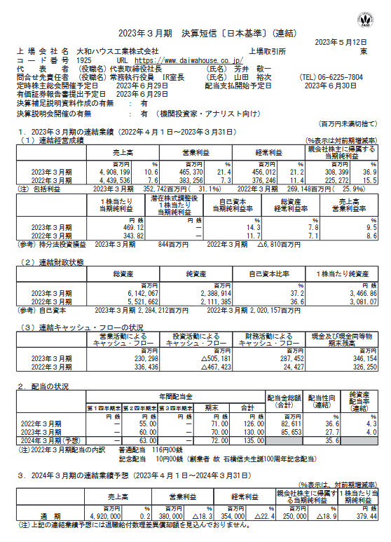 大和ハウス工業(1925)の株価は上昇。配当利回りは3.8%(2023年5月24日・株式取引概況)