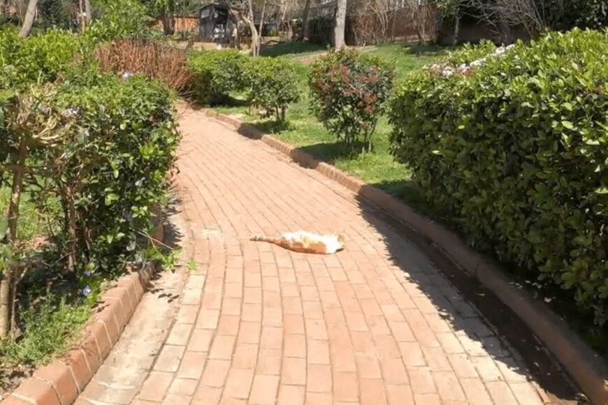 そこに収められていたのは、小さな道の真ん中で日向ぼっこをしている猫の姿。同じ目線で撮影するため、カメラの位置を下げると…。