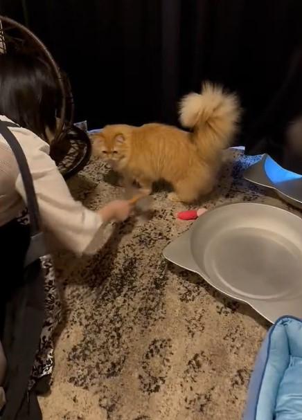 動画には猫の毛を掃除するママさんの姿があります。そして隣には、もふもふとした茶色の被毛が印象的な「エマ」ちゃんがいます。