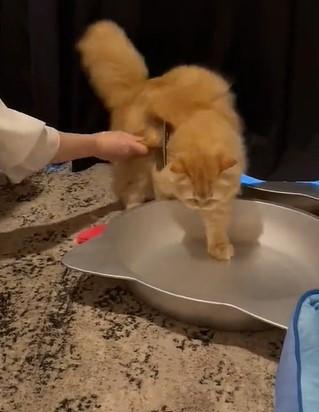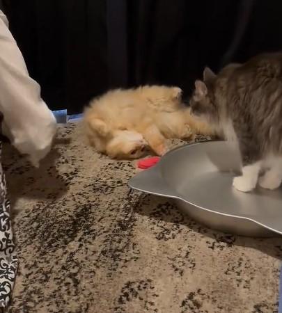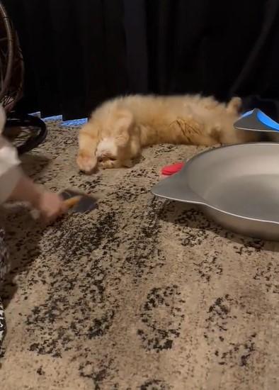 レイくんが去ると、猫ちゃんの形をしたひんやりマットのような場所に足を運んだエマちゃん。移動するエマちゃんに、さりげなくブラシをかけるママさんの振舞いに愛を感じます。