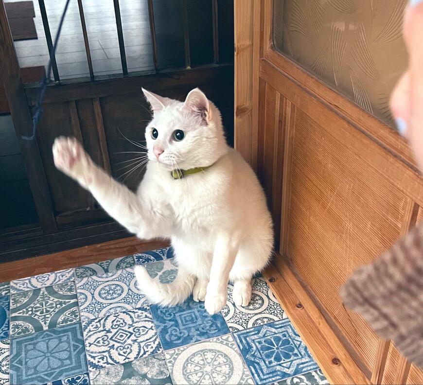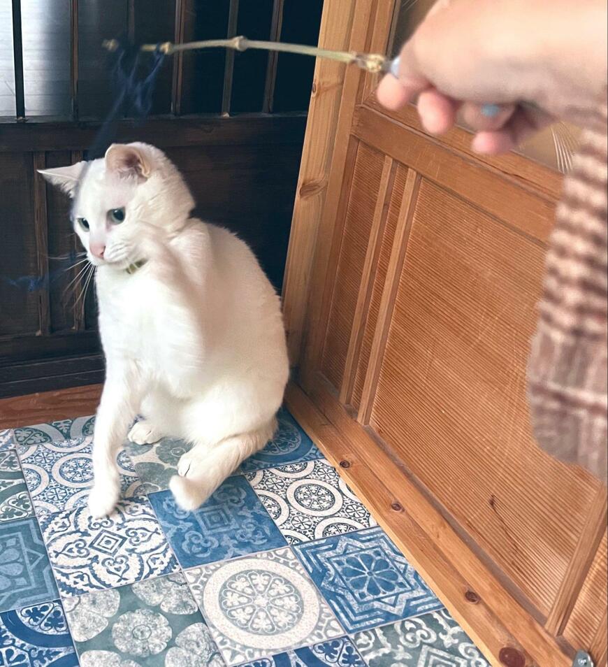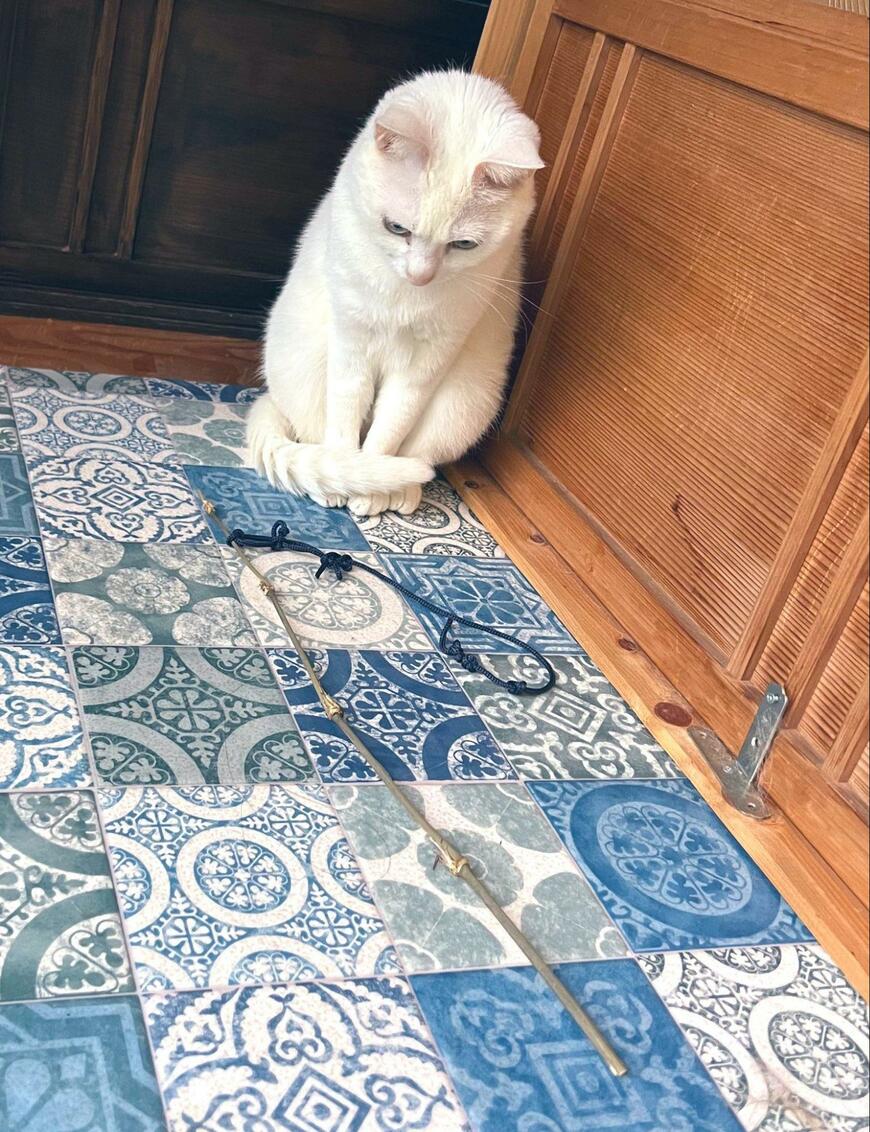 1枚目に写る猫ちゃんは、持ってきたおもちゃの前に佇んでいます。お行儀よくお座りしている姿からは健気な雰囲気が漂います。猫ちゃんは「遊ぼうよ」とアピールしているようですが……?