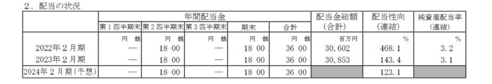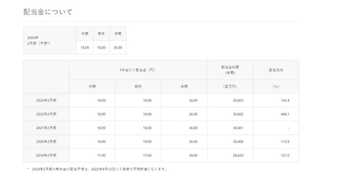イオンの株式を1年前に買い、持ち続けたとすると、「2023年2月期の中間配当」と、「2023年2月期の期末配当」の計2回を受け取ることができます。