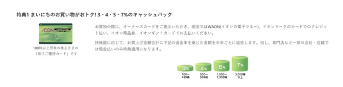 イオンは決算期(2月28日)現在、100株以上保有する株主に向けて、株主優待カード(オーナーズカード)を発行しています。持株数に応じて3・4・5・7%のキャッシュバックを受けられます。